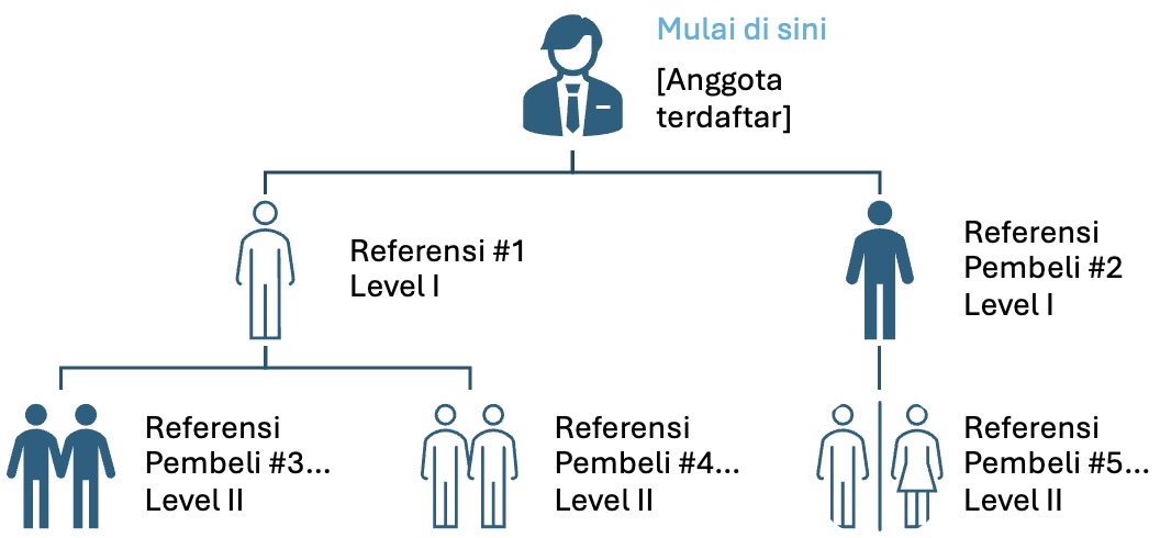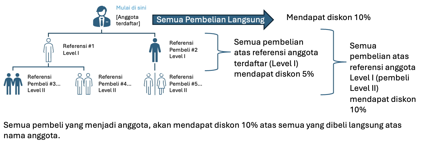 Apabila pembeli yang anda referensikan telah menjadi anggota dan mereferensikan lagi ke teman / kolega-nya. Anda kami beri lagi tambahan rebate / atau bonus dari seluruh pembelian mereka.